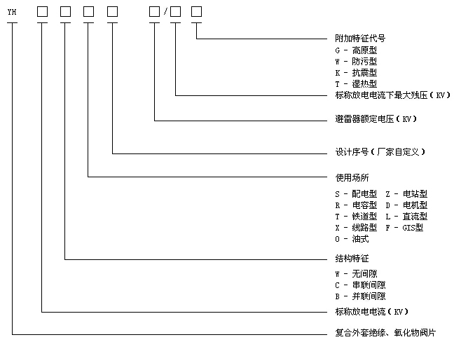 复合外套金属氧化锌避雷器 该产品的核心工作元件采用以氧化锌为主的多元素金属氧化物粉末烧制,具有优异的非线性伏-安特性,陡波响应快,通流容量大。有间隙产品采用自吹间隙,带均压照射结构,降低了放电的分散性,冲击系数小。 复合绝缘外套的采用,顺应了国际电力产品小型化、安全化、免维护的发展趋势。高分子有机复合材料与传统的陶瓷和玻璃等无机材料相比,具有体积小、重量轻、耐污秽免清扫、防爆防震动的优点。是集成化、模块化的中高压输变电成套设备中首选的防雷元件。用途及执行标准: 本产品使用于交流220kV及以下发电、输电、变电、配电系统,用于将雷电和系统内部操作过压电的幅值限制到规定的水平,是整个系统绝缘配合的基础设备。同时,本产品不能用于限制谐振过电压,系统消谐需要采用其它方式。 本产品型号按JB/T8459-1996《避雷器产品型号编制方法》规定进行编制,无间隙产品执行GB11032-2000《交流无间隙金属氧化物避雷器》标准;有间隙产品执行JB/T9672-2005《有串联间隙金属氧化物避雷器》标准。对以上标准中未明确定义的重要参数及配置方式,按DL/T620-1997《交流电气装置的过电压保护和绝缘配合》的要求修正执行。使用条件: 常规产品正常使用条件如下: * 环境温度:不高于+40℃,不低于-40℃; * 海拔高度:不超过2000m; * 电源频率:50±2Hz;60±2Hz; * 地震强度:7度以下; * 最大风速:35m/s; * 免清扫条件:中等污秽及以下地区; * 对无间隙产品,长期施加的工频电压不得超过避雷器持续运行电压; 对有间隙产品,安装点短时工频电压升高不得超过避雷器额定电压。 长期使用于以下异常条件,避雷器需特别制作,定货时应说明: * 温度或海拔超标(高原、热带、寒带、全封闭柜用、靠近电炉等) * 使用环境存在严重潮气或腐蚀性气体杂质(水上、盐场、化工厂等); * 强紫外线辐射(高原、强日照干旱地区等); * 特重污秽地区(矿山工作面、建筑工地工作面等)。型号定义: 本产品型号定义完全执行JB/T8459-1996《避雷器产品型号编制方法》的规定,具体型号说明如下: